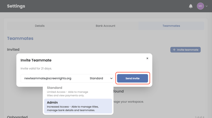 - Admin - Can manage settings, update bank account, and add teammates in addition to standard access features.