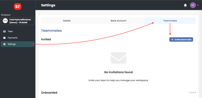 1. Navigate to your workspace, and click on Settings > Teammates > Invite teammate.