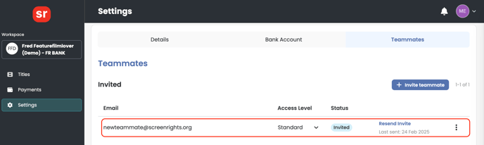 3. Once you have sent an invitation, a log will be saved under the Teammates section in Settings. You can track its status here and click to resend the invite if required. Invitations sent to teammates expire in 21 days.